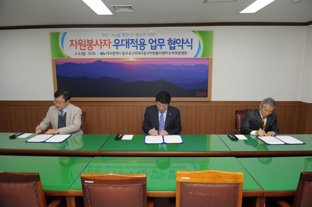 2015년 4월 6일 동구청 & (사)동구자원봉사센터 & 바로본병원과 업무 협약식을 맺었습니다.
