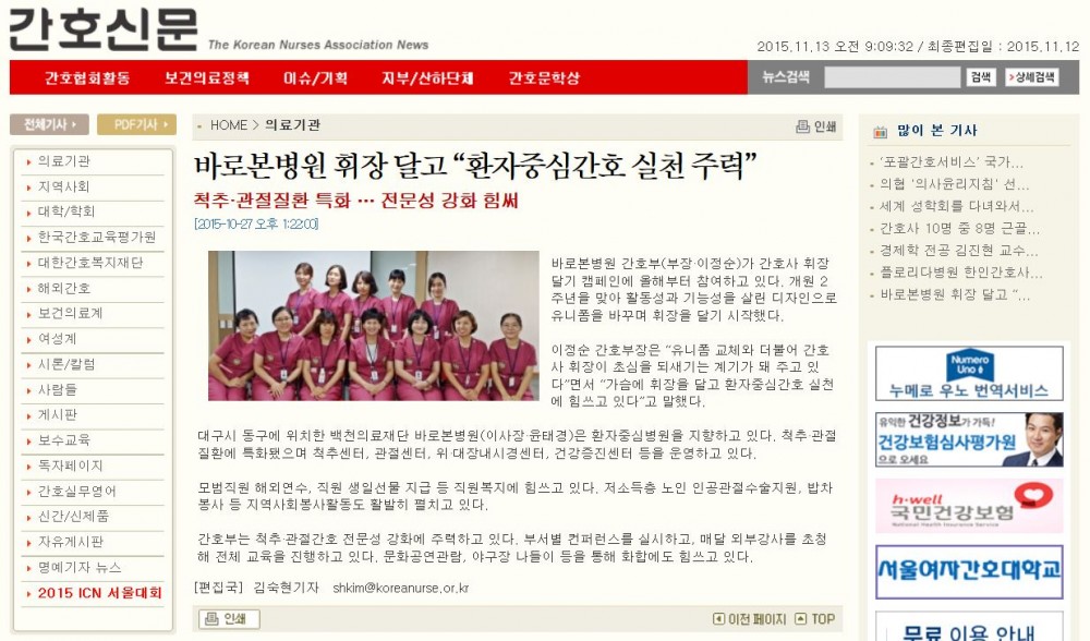 [간호신문] 바로본병원 휘장 달고 “환자중심간호 실천 주력”
