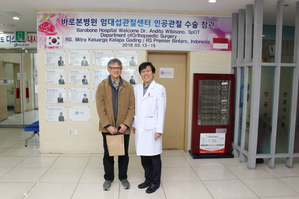 바로본병원은 2018년 1월에 "독일 임플란트 캐스트사 인공관절수술 아시아지역 대표 교육협력센터 지정" 이후 인도네시아 안디토 위비소노 학회장님(정형외과)이 엄대섭관절센터 인공관절 수술 참관을 위해 방문 하였습니다.