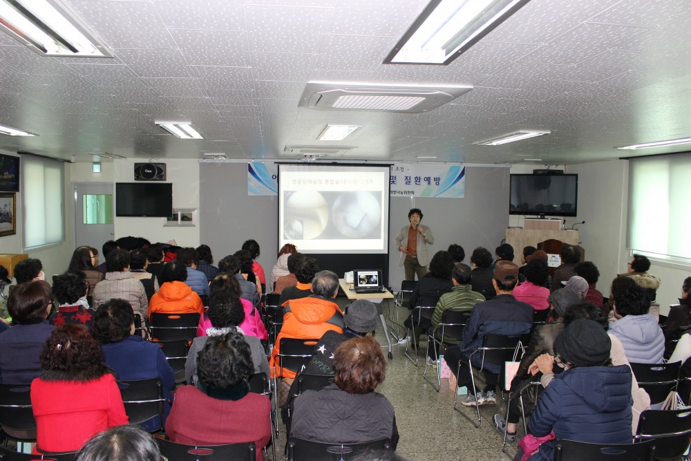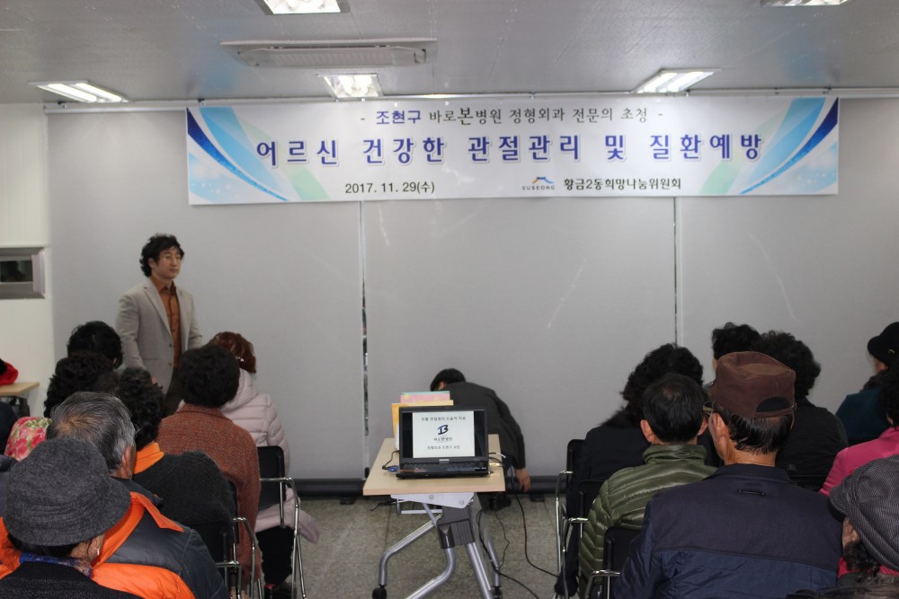 2017년 11월 29일 수성구 황금 2동 주민센터에서 "어르신 건강한 관절관리 및 질환예방" 이란 주제로 조현구과장님의 유쾌한 강의가 있었습니다. 60여명의 황금동 어르신들께서 경청해주셨습니다.