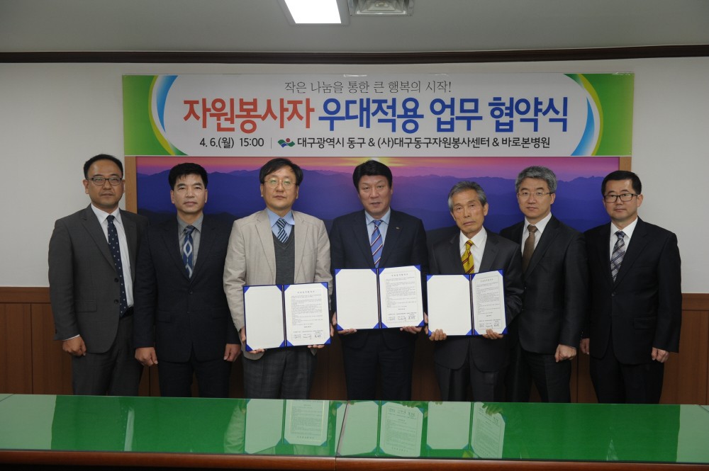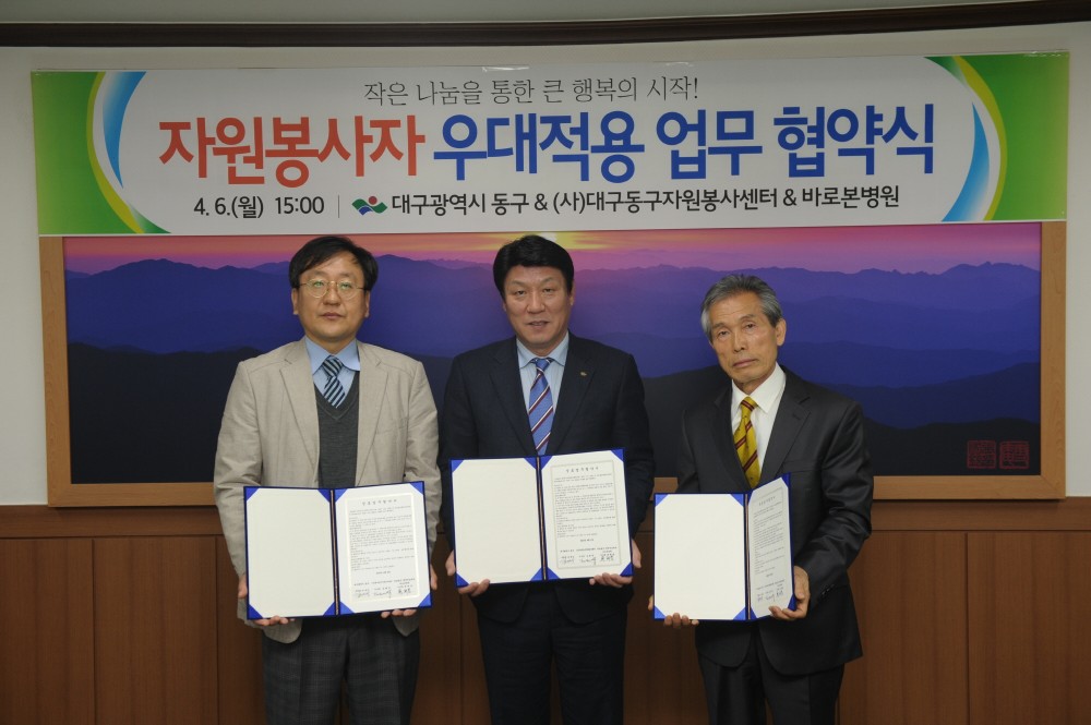 2015년 4월 6일 동구청 & (사)동구자원봉사센터 & 바로본병원과 업무 협약식을 맺었습니다.