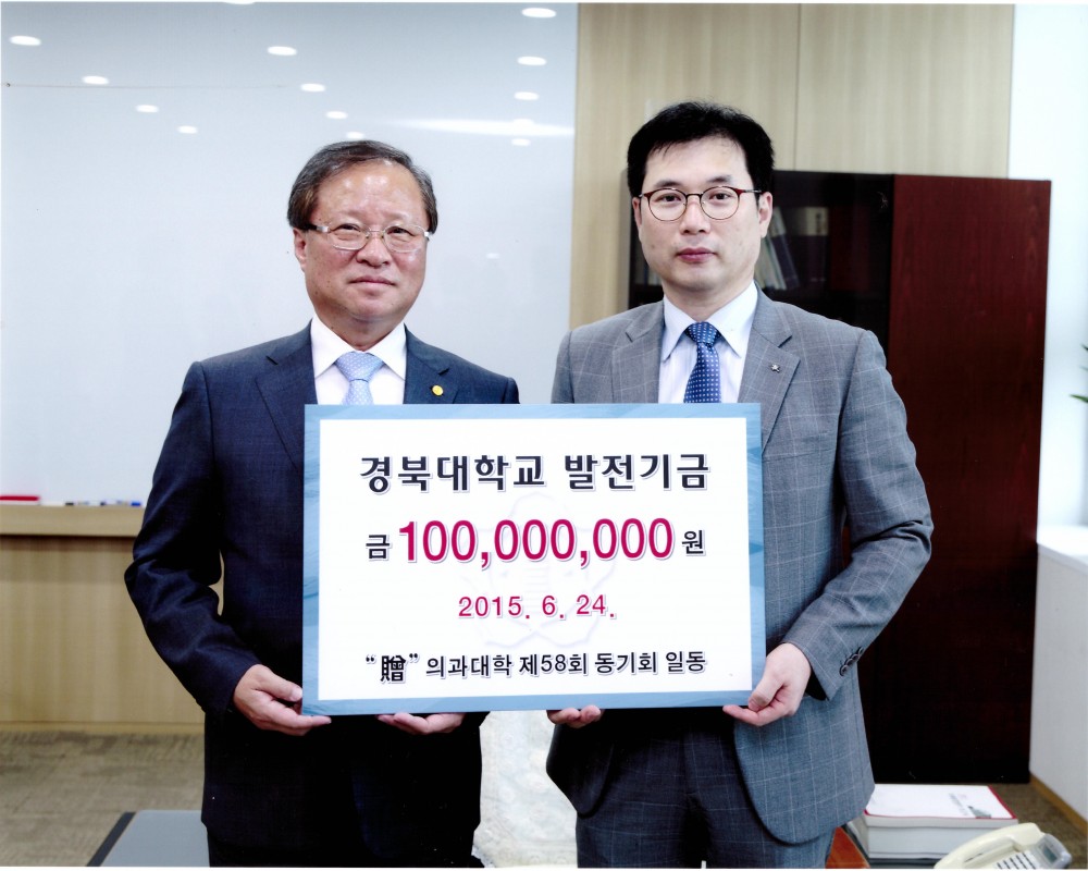 본원 최재석병원장님께서 2015년 6월 24일 경북대학교 발전기금 1억원을 경북대학교 의과대학 58회 동기를 대표하여 기부하는 자리에 참석하셨습니다.