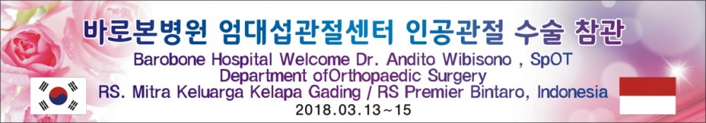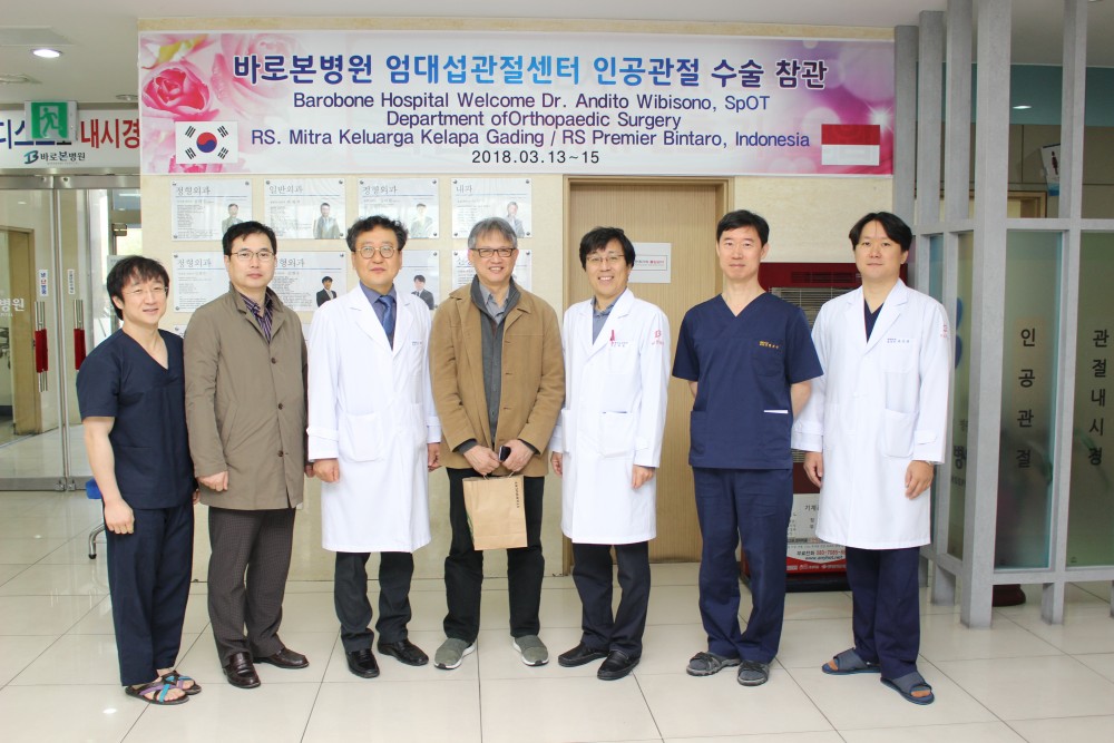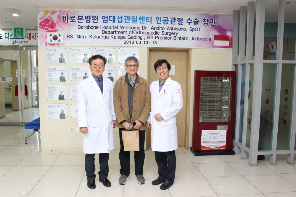 바로본병원은 2018년 1월에 "독일 임플란트 캐스트사 인공관절수술 아시아지역 대표 교육협력센터 지정" 이후 인도네시아 안디토 위비소노 학회장님(정형외과)이 엄대섭관절센터 인공관절 수술 참관을 위해 방문 하였습니다.
